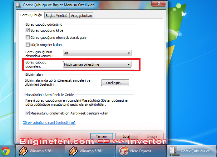 Windows 7 de Görev çubuğu üzerindeki benzer düğmeleri gruplama işlemini iptal etmek için müteakip maddelerde belirtilen işlemleri yapınız.