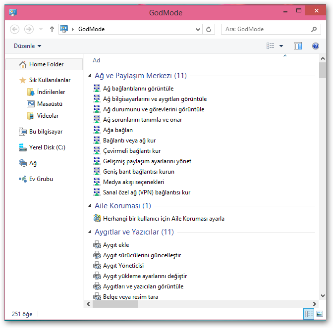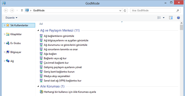 Klasörün adını değiştirdikten sonra Enter tuşuna bastığınızda karşınıza Windows denetim masasına benzer bir simgeyle GodMode menüsü gelmiş olacak.