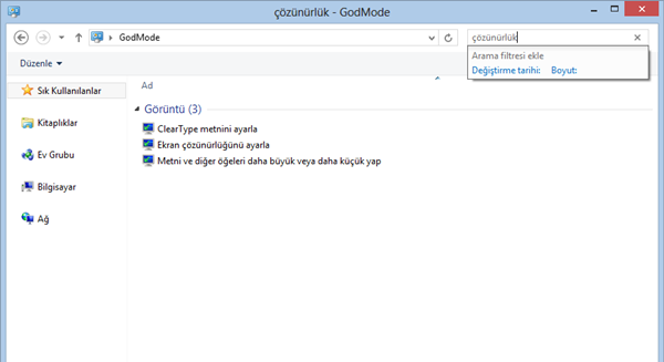 Tam olarak neyi kastettiğimi anlamadıysanız ve merak ediyorsanız GodMode menüsünde arama çubuğuna çözünürlük, yazı tipi, boyut gibi anahtar kelimeleri yazarak karşınıza gelen araç listesinden ihtiyacınız olanlara kolayca ulaşabileceğinizi göreceksiniz.