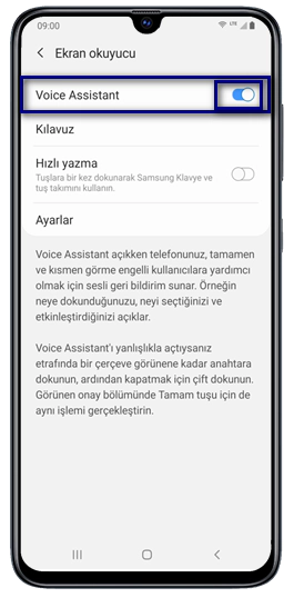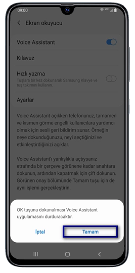 Samsung Cihazınızda Voice Assistan (Talkback) özelliğini devre dışı bırakmak için lütfen aşağıdaki adımları takip edin: